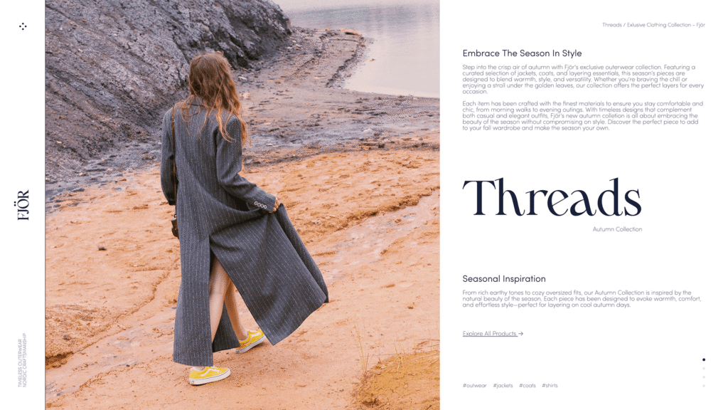 Ένα web design με καθαρές γραμμές, ήρεμη αισθητική και εστίαση στην εμπειρία χρήστη. Το layout αναδεικνύει υψηλής ποιότητας visuals, συνδυάζοντας ένα seamless shopping flow σε όλες τις συσκευές. Στόχος: μια ψηφιακή παρουσία που μεταφέρει κομψότητα, άνεση και εποχιακή έμπνευση, μετατρέποντας την περιήγηση σε φυσική αγοραστική ροή.